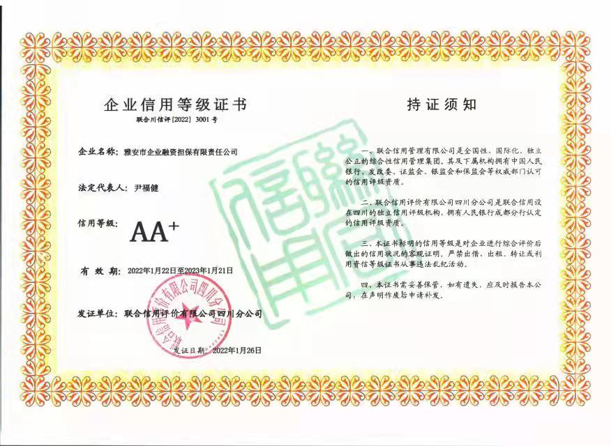 1月28日,從雅安市企業(yè)融資擔(dān)保有限責(zé)任公司(以下簡(jiǎn)稱(chēng)“市擔(dān)保公司”)傳來(lái)喜訊,經(jīng)聯(lián)合信用評(píng)價(jià)有限公司通過(guò)對(duì)市擔(dān)保公司的信用狀況進(jìn)行綜合分析和評(píng)估,確定該公司信用等級(jí)為AA+。