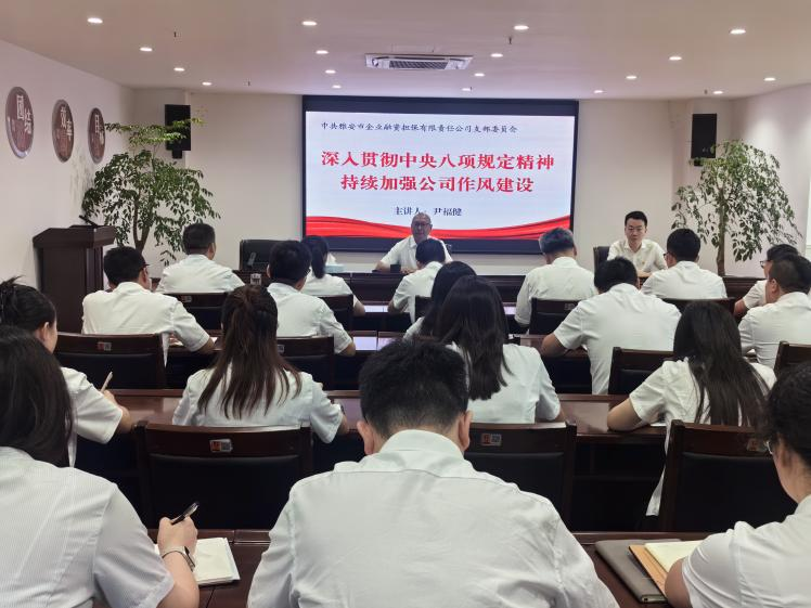 二是黨支部書記講專題黨課。市擔保公司黨支部書記、董事長尹福健以“深入貫徹中央八項規(guī)定精神,持續(xù)加強公司作風建設”為題,為全體黨員、入黨積極分子講授了一堂生動的專題黨課。黨課圍繞充分認識開展學習教育的重大意義、深刻把握中央八項規(guī)定精神的豐富內涵和實踐要求、充分認識違反中央八項規(guī)定精神的嚴重性和危害性以及準確把握黨的作風建設的重點任務,自覺強黨性正作風守紀律等4個方面展開,為進一步加強作風建設指明了方向、提供了遵循。